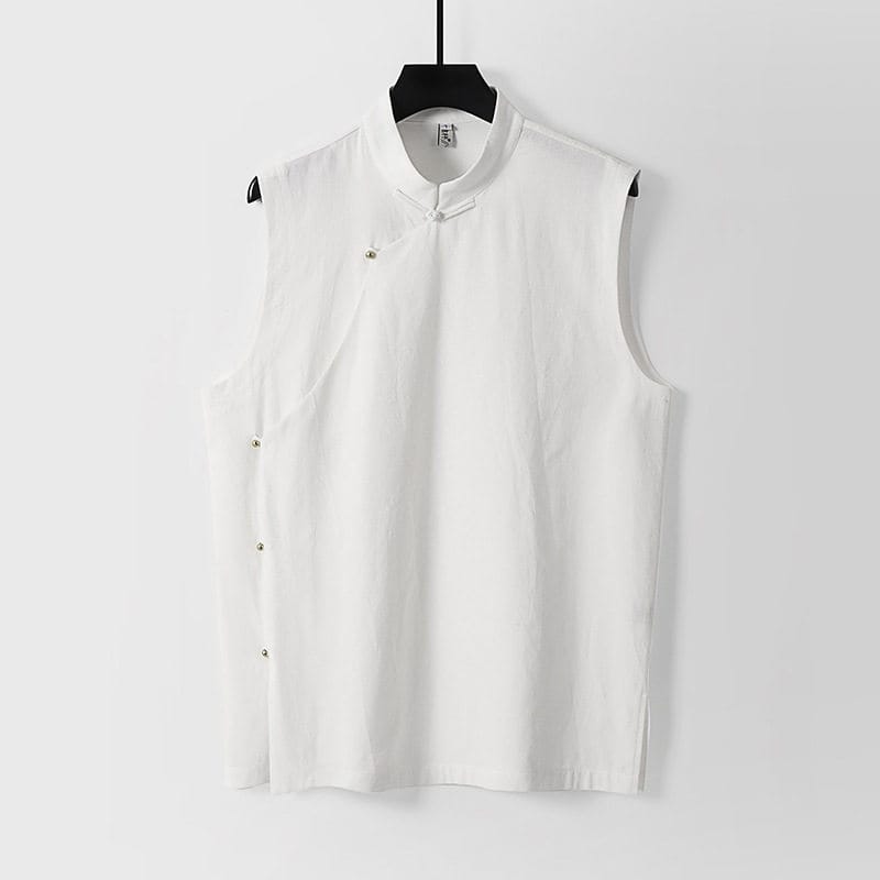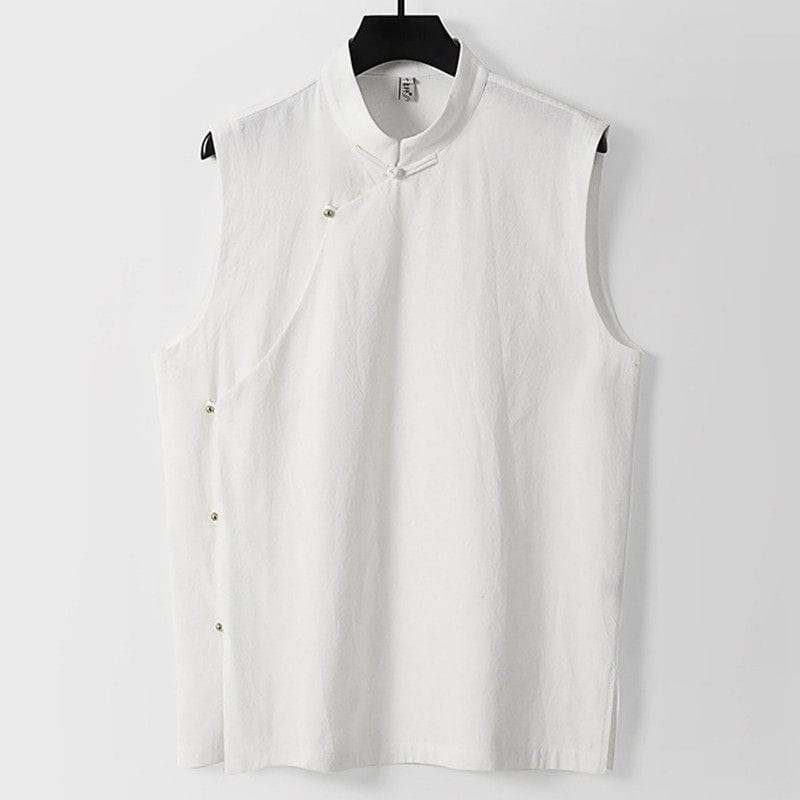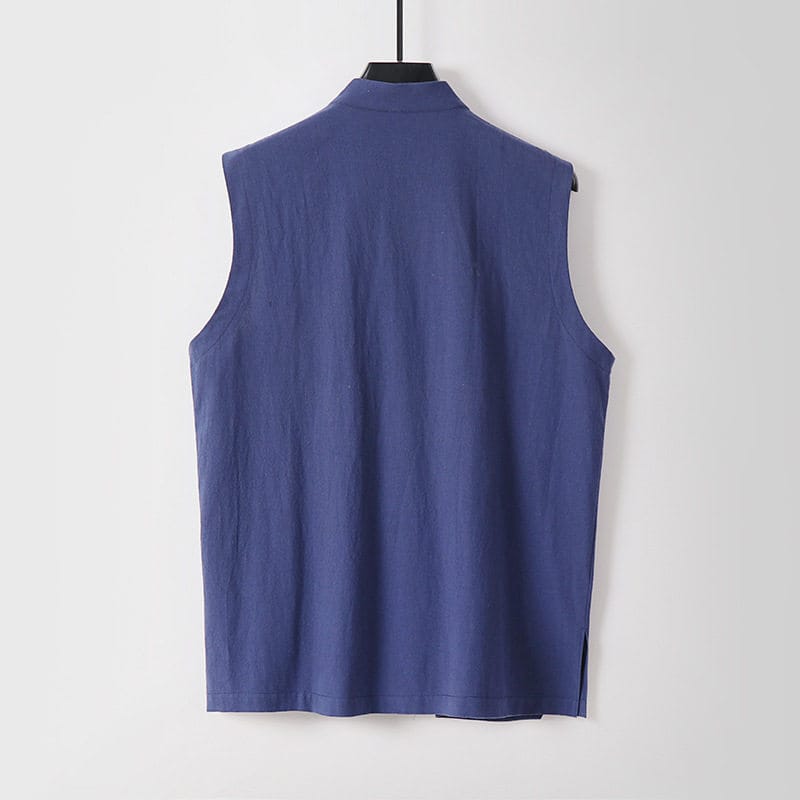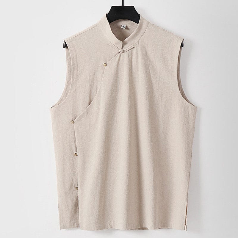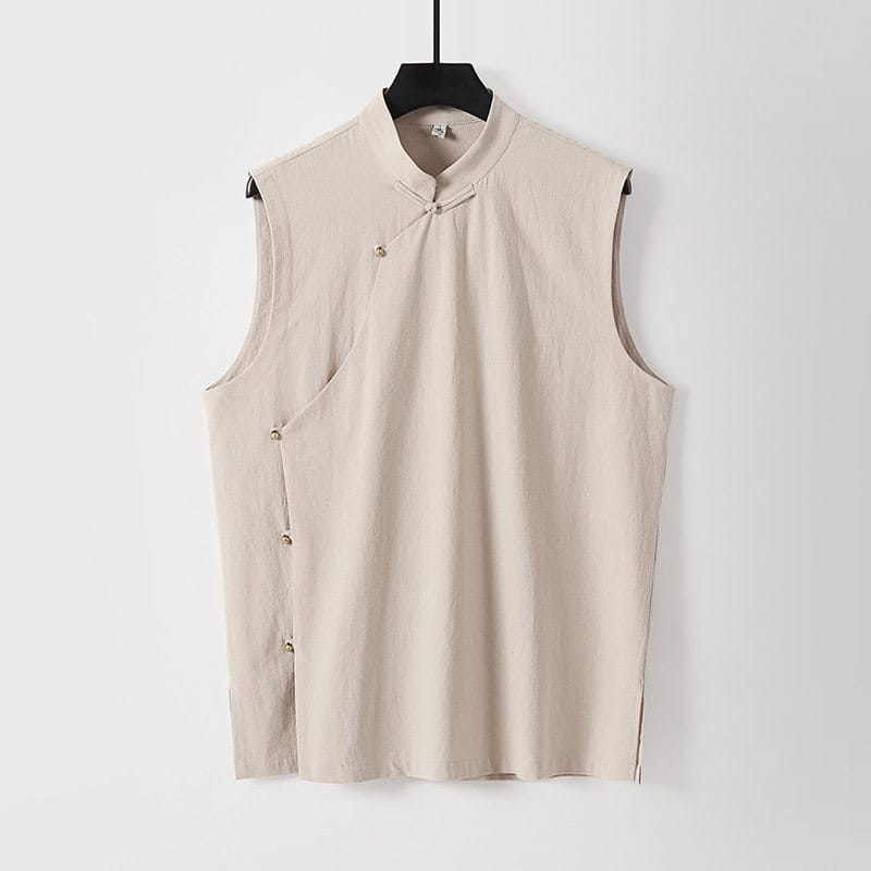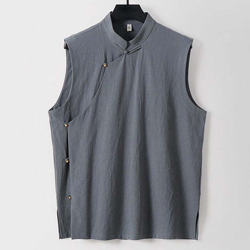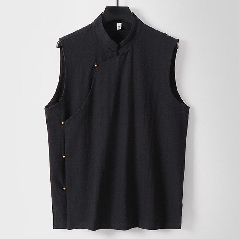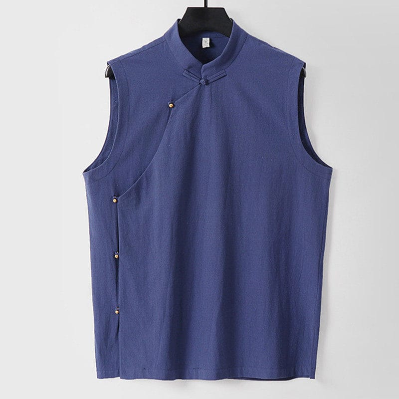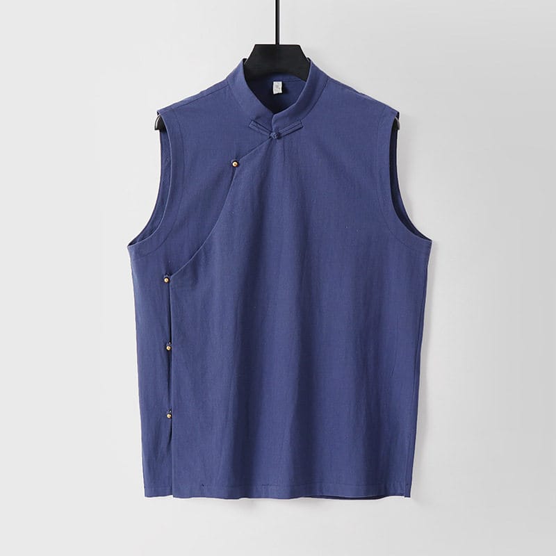 がっちり体型、肥満体型向けの斜め前立てチャイナベストです。スタンドカラーと斜め前立てを留める金色のチャイナボタンが特徴的