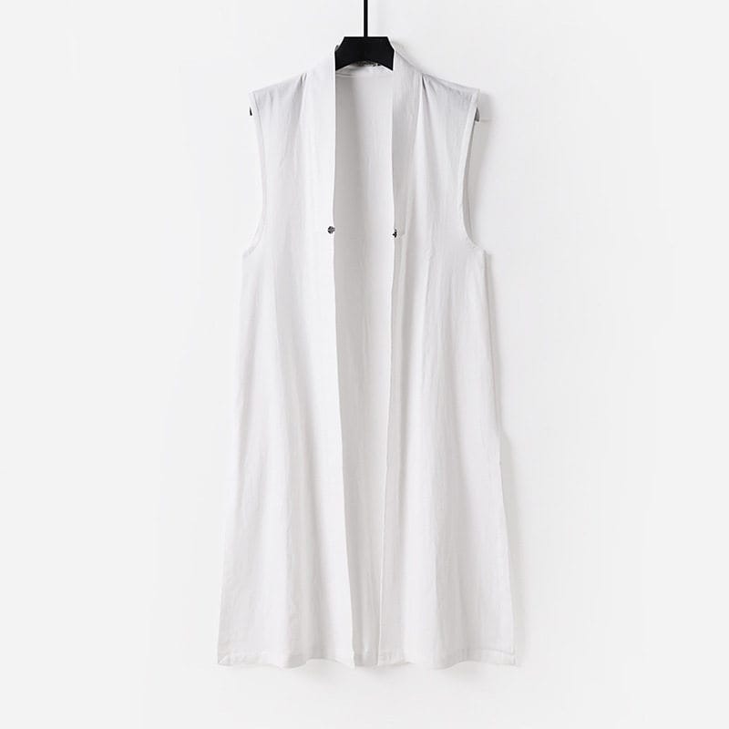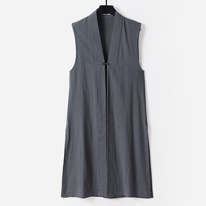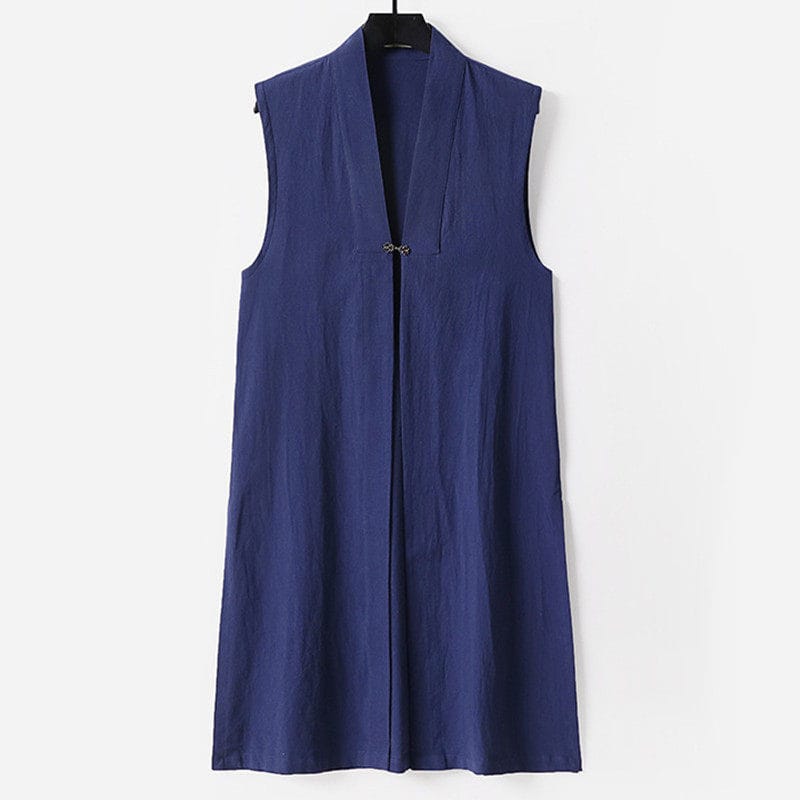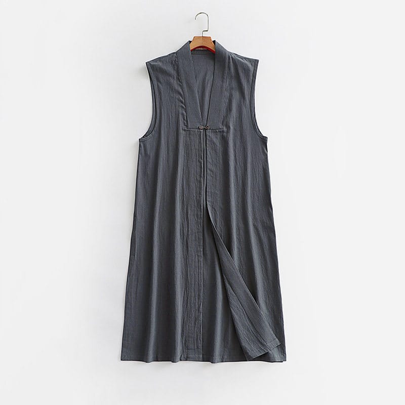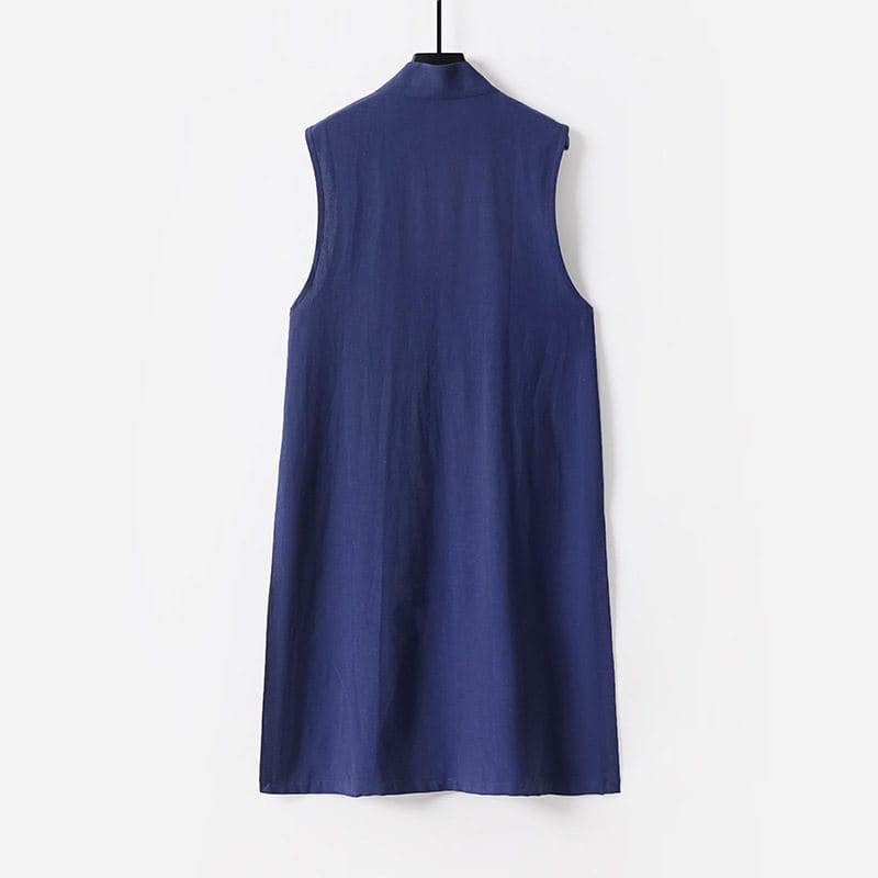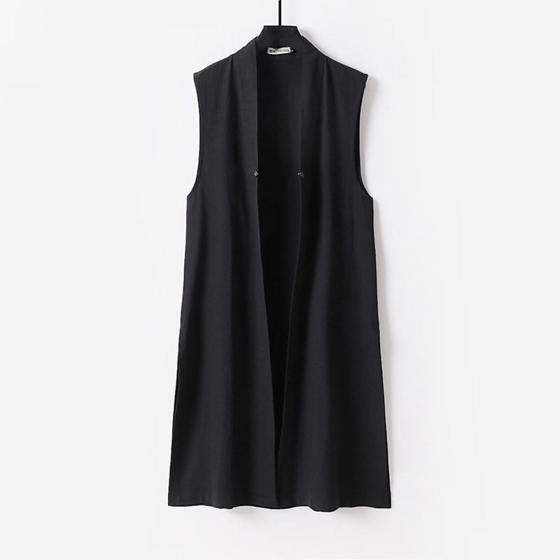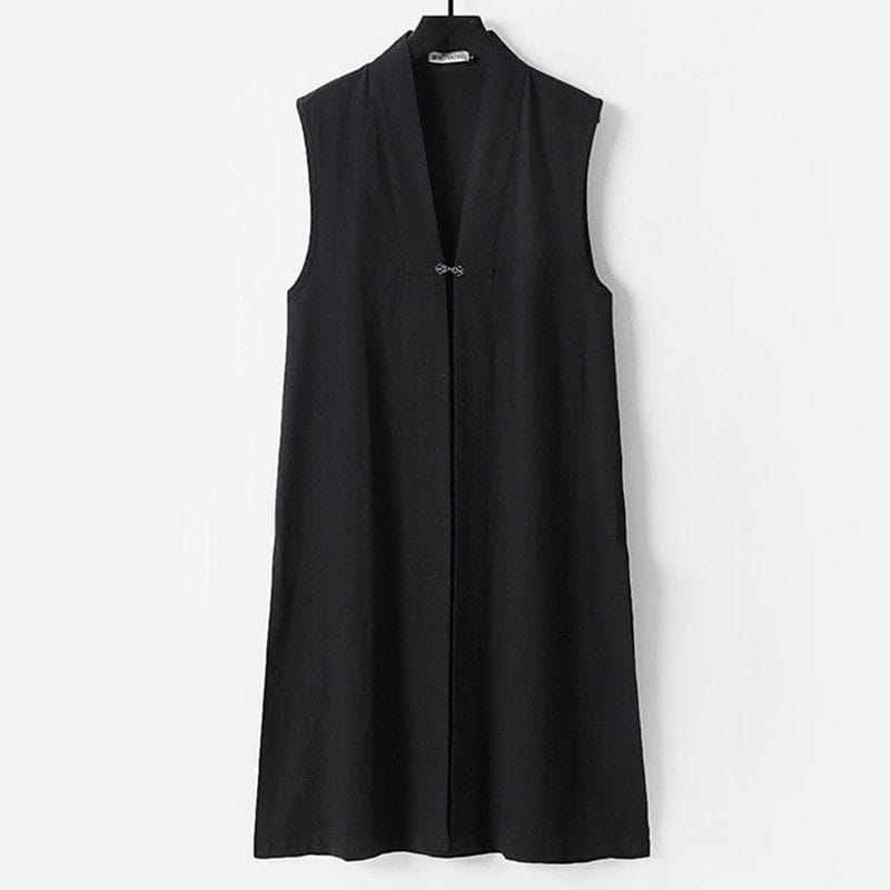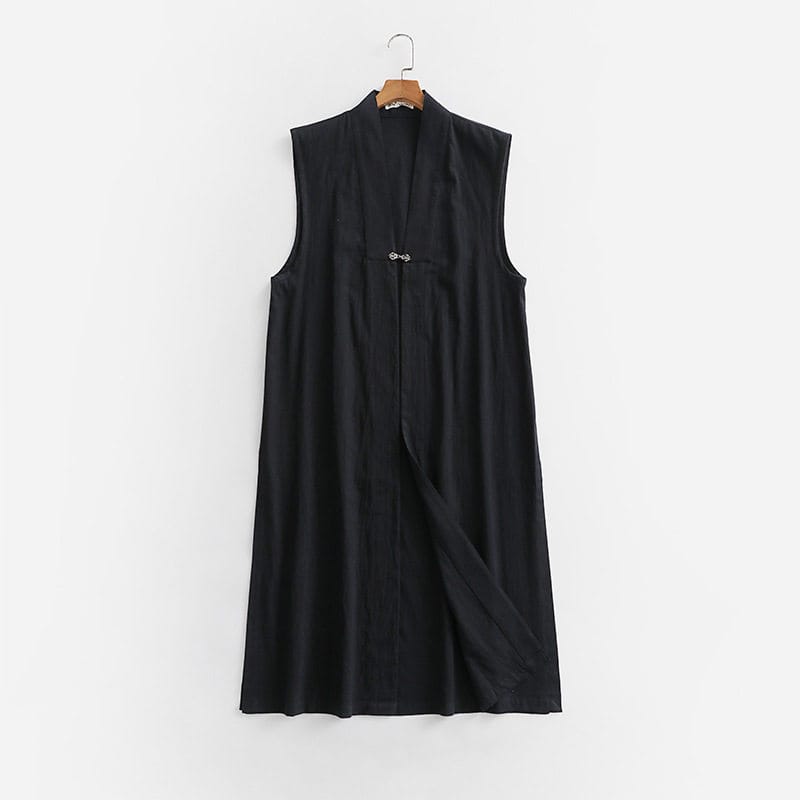 がっちり体型、肥満体型向けの中国風ロングノースリーブベストです。ゆったりとしたAラインシルエットと装飾的なチャイナボタンが印象的