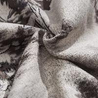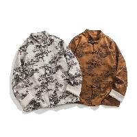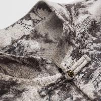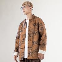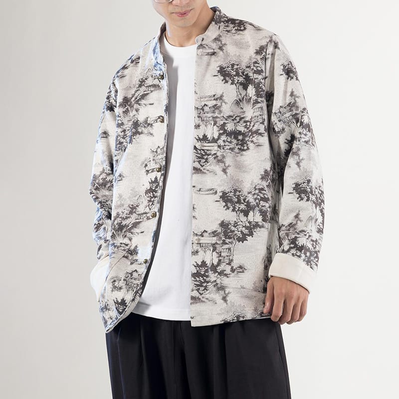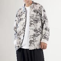 山水画風の墨絵プリントが特徴的で、立襟とチャイナボタン(盤扣)を配したトラディショナルなデザイン。