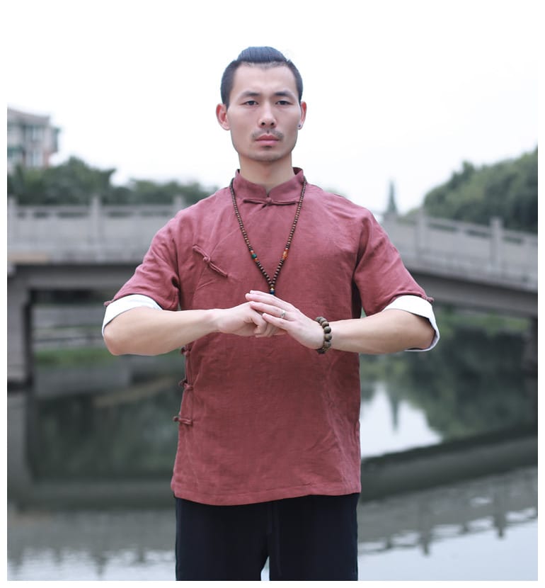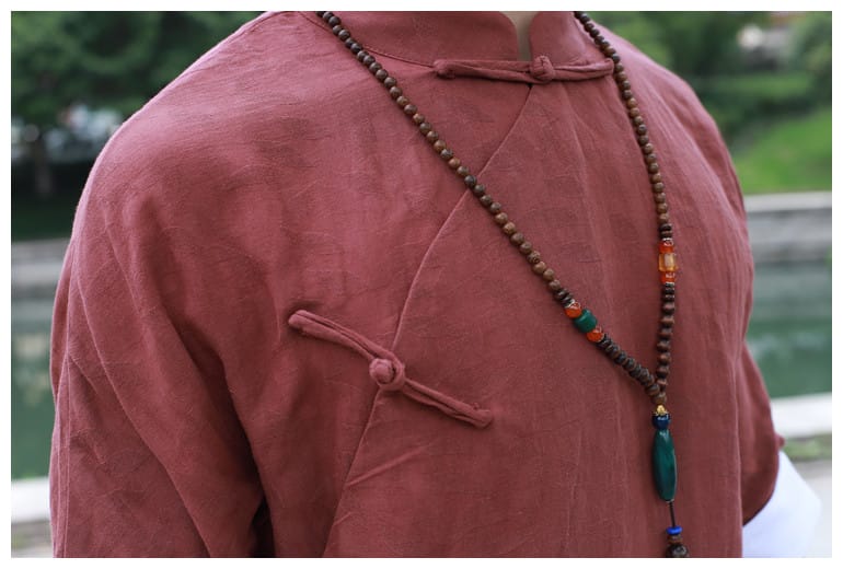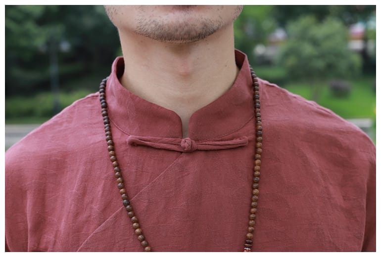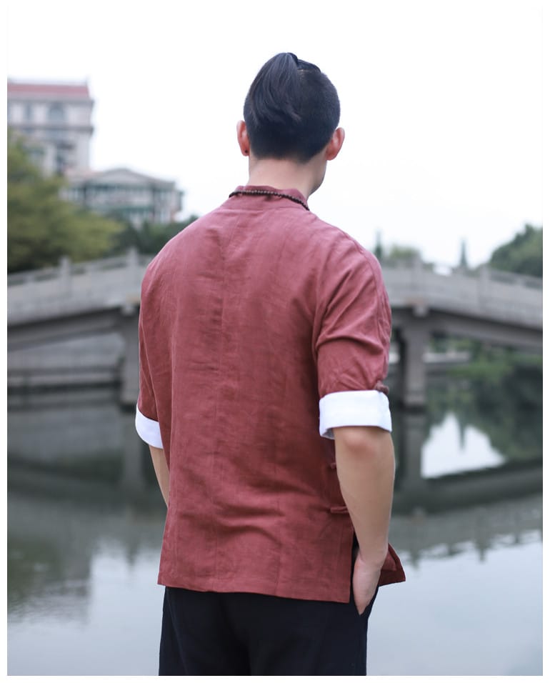 漢服のような斜め開き襟の七分袖Tシャツです。