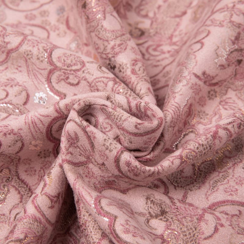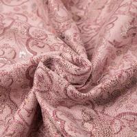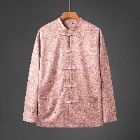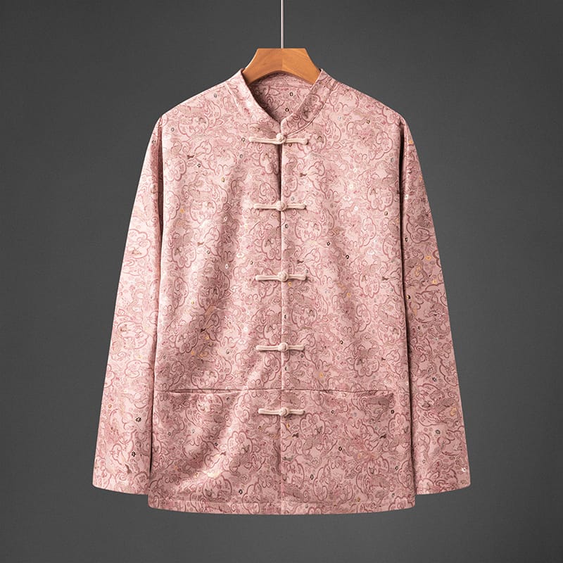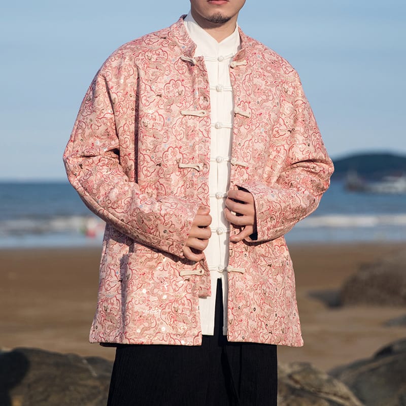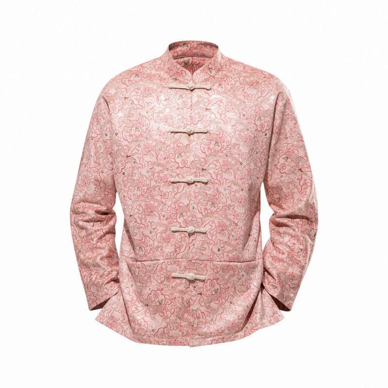 ピンク地に龍や花柄の総ジャカード織りが華やかなスタンドカラージャケットです。白い布製チャイナボタンがエレガントさを添え、裏地は黒のサテン仕上げ。