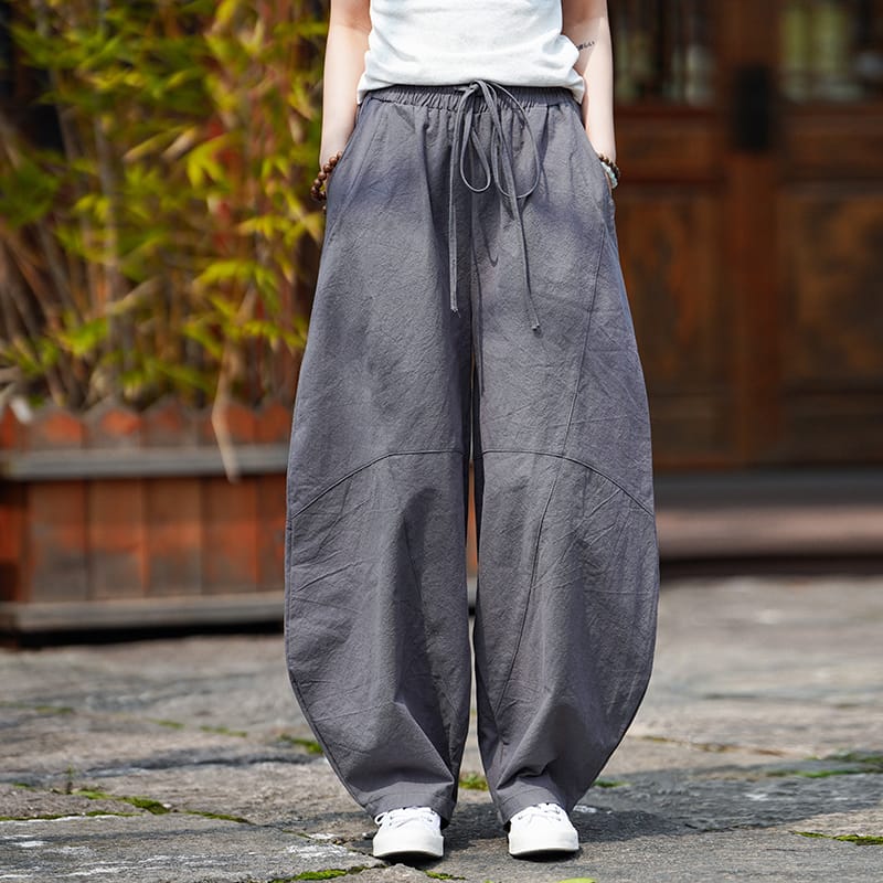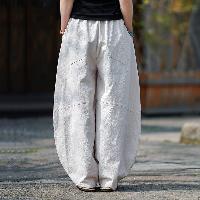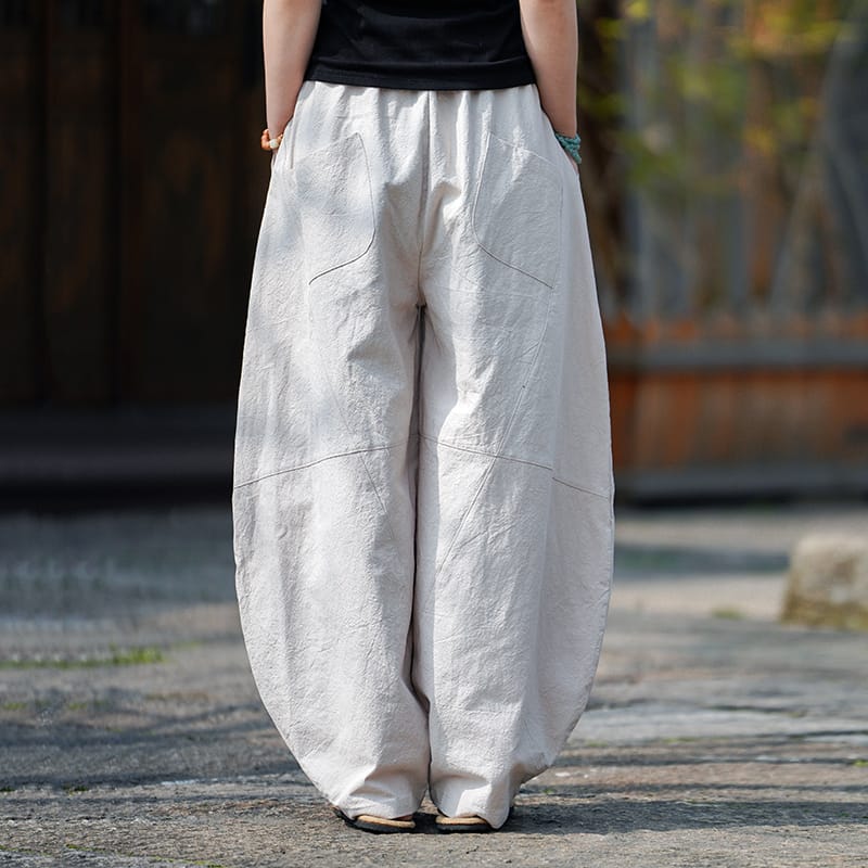 厚めのコットンリネン素材を使用し、ゆったりとした裾すぼまりのハーレムパンツデザインが特徴。