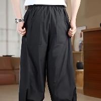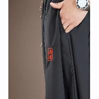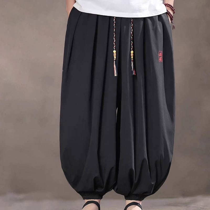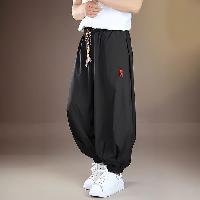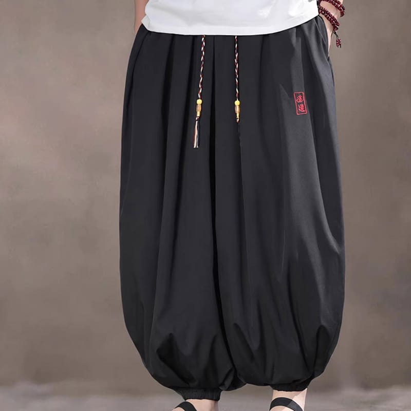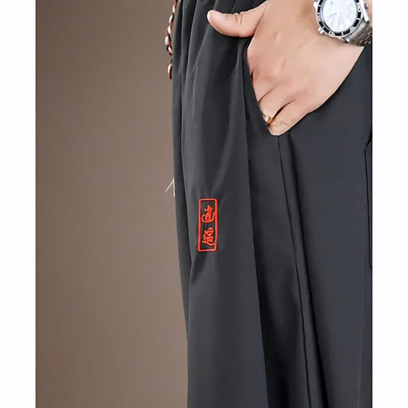 軽やかな垂れ感と速乾性を備え、ウエストの三つ編みの飾り紐と赤い漢字刺繍がアクセント。