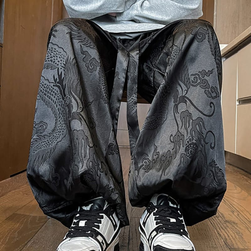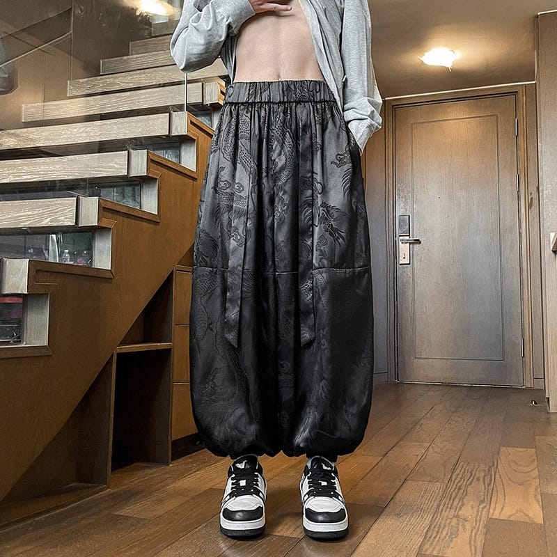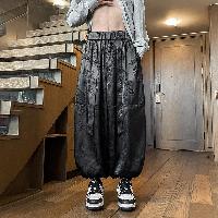 黒地に龍と雲のジャカード織りを全面に配したチャイナパンツです。