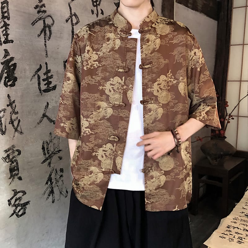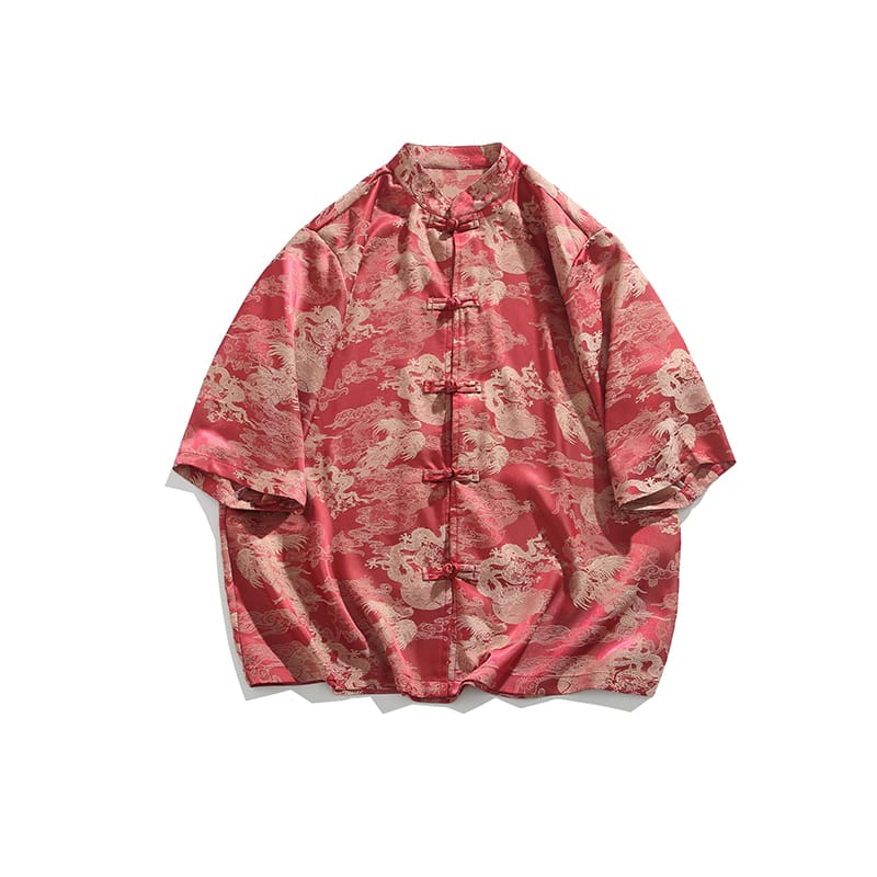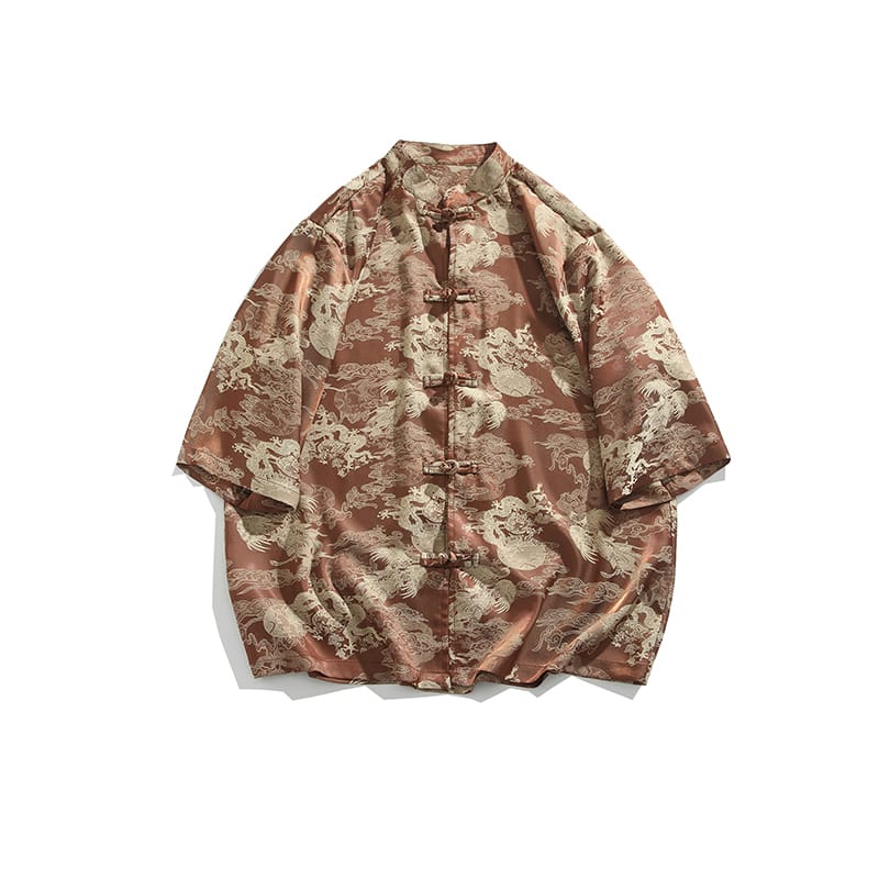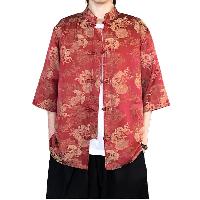 薄手で涼しいアイスシルク素材を使用した5分袖チャイナシャツです。鳳凰柄がジャガード織りで描かれ、立襟と伝統的なチャイナボタンが特徴。