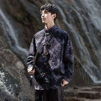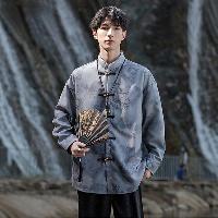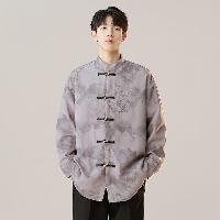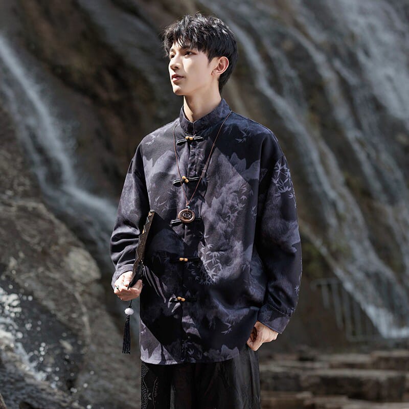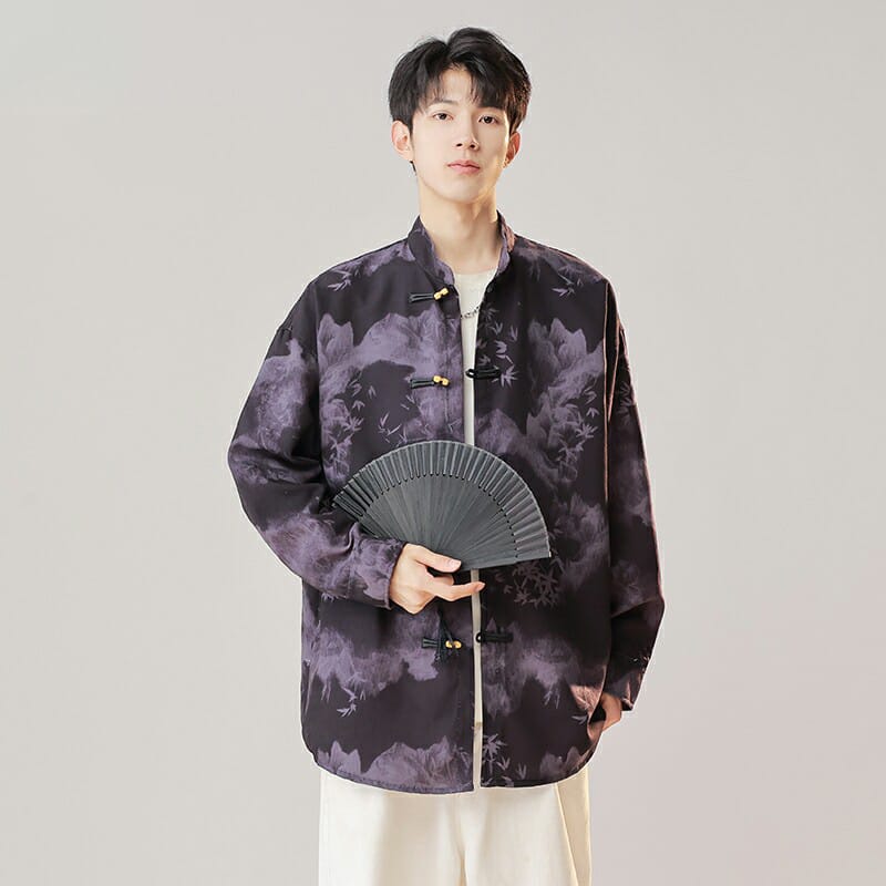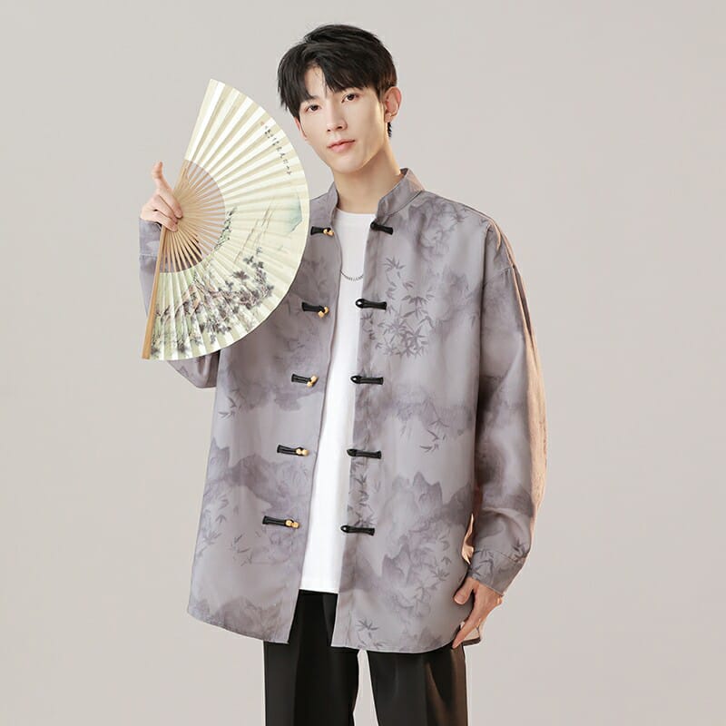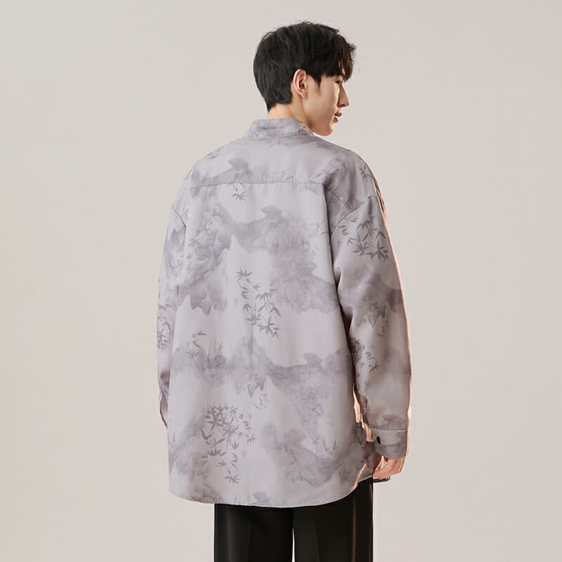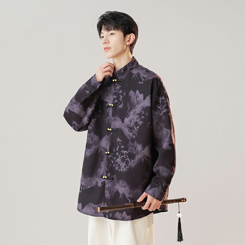 水墨画風の竹・山水柄が映えるモダンな中国風シャツです。木製ビーズ付き伝統的なチャイナボタンがアクセント。