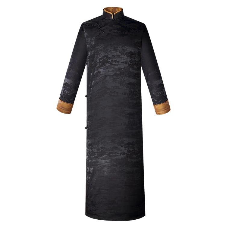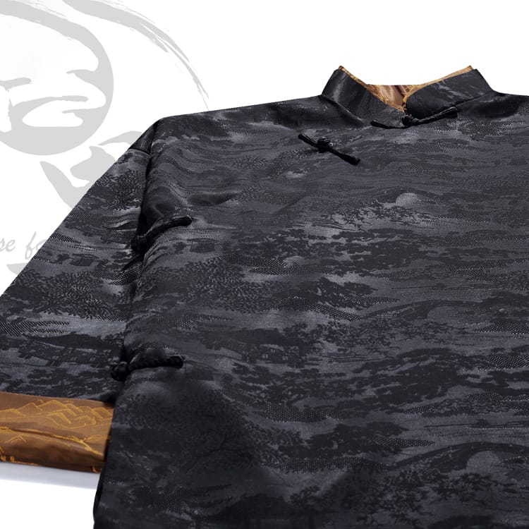 ダマスク織の高級生地を使用したチャンパオです。襟と袖口に金色の風景柄がプリントされた茶色の配色が特徴!