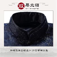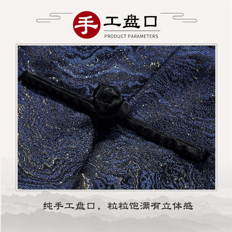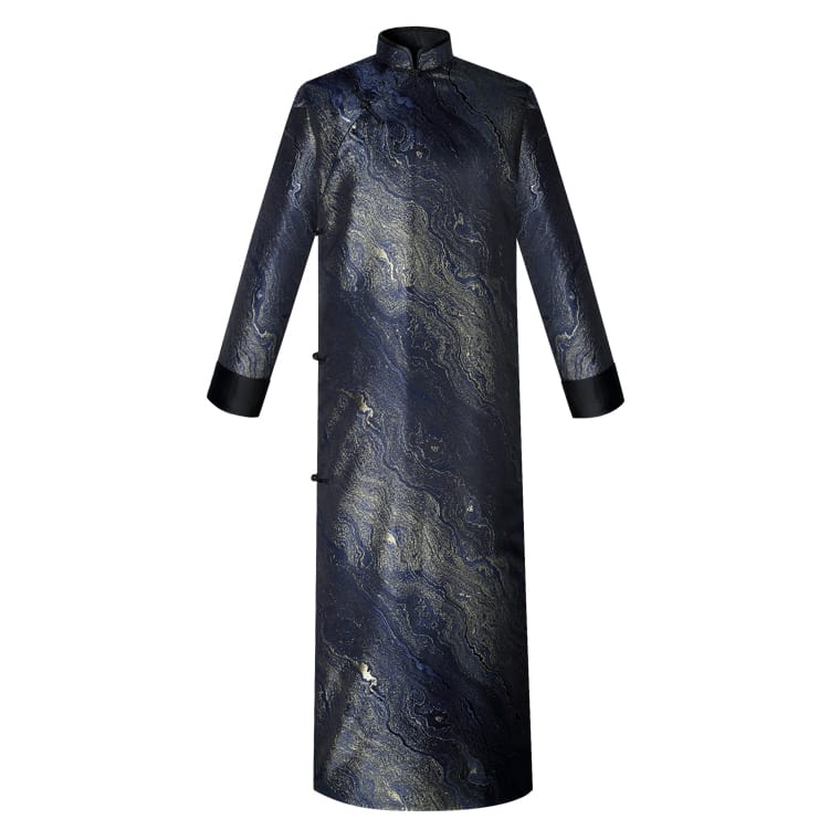 金色の星空模様が輝く高級サテン生地を使用したチャンパオです。立襟とチャイナボタンの伝統的デザインで、袖口は黒のベルベット仕上げ。