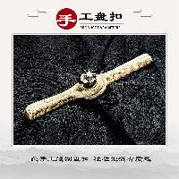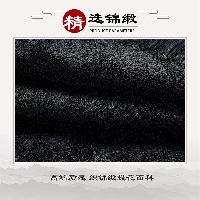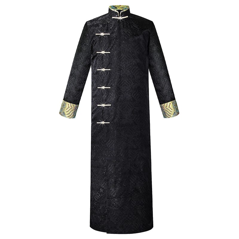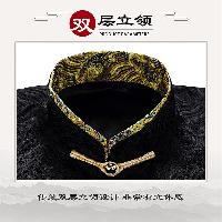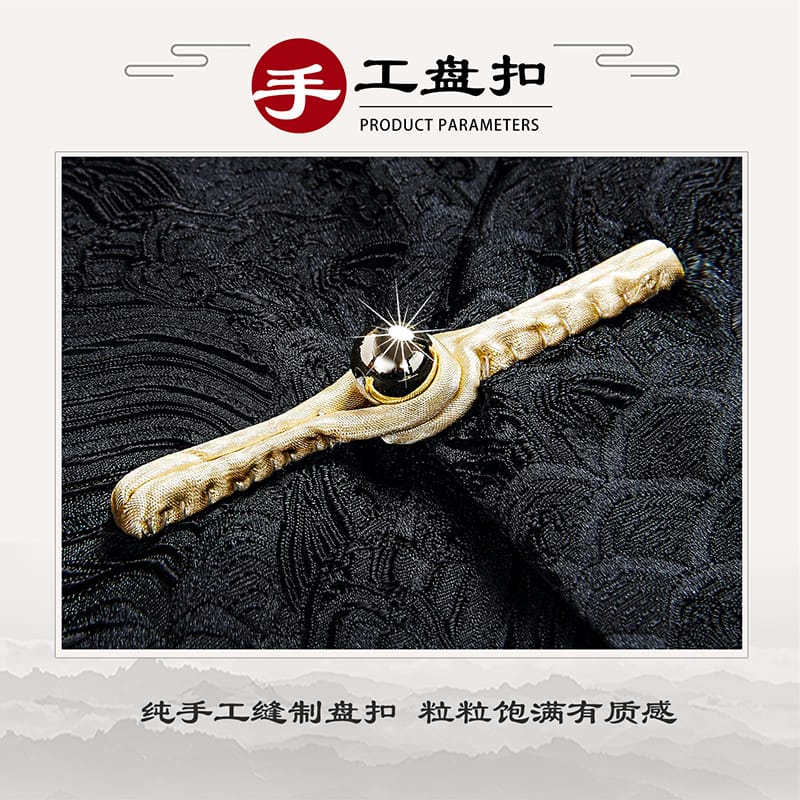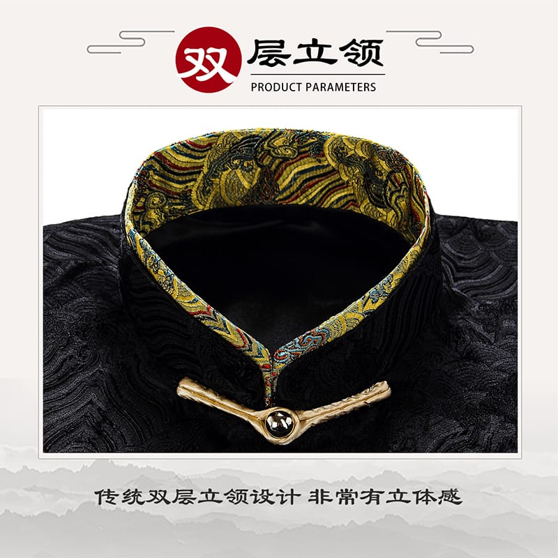 黒色の海水紋様サテン生地を使用した格調高いチャンパオです。襟と袖口に金色の龍紋刺繍を配し、手工芸の盤扣ボタンで留めます。