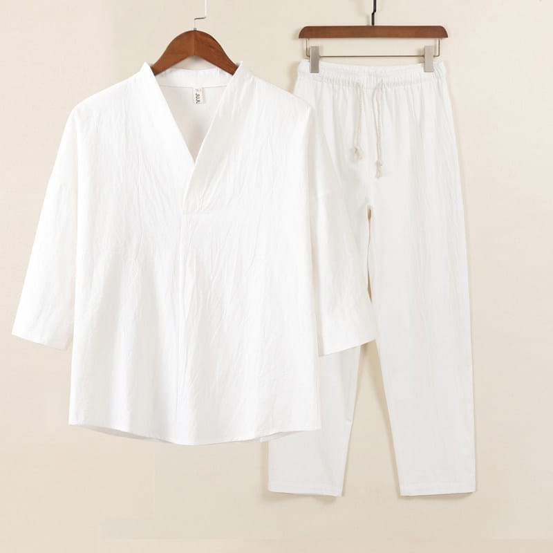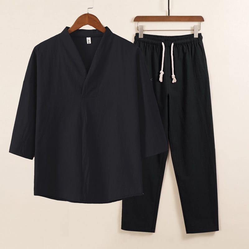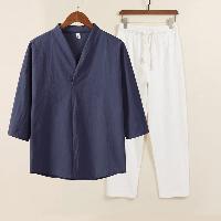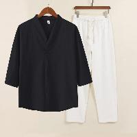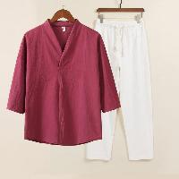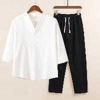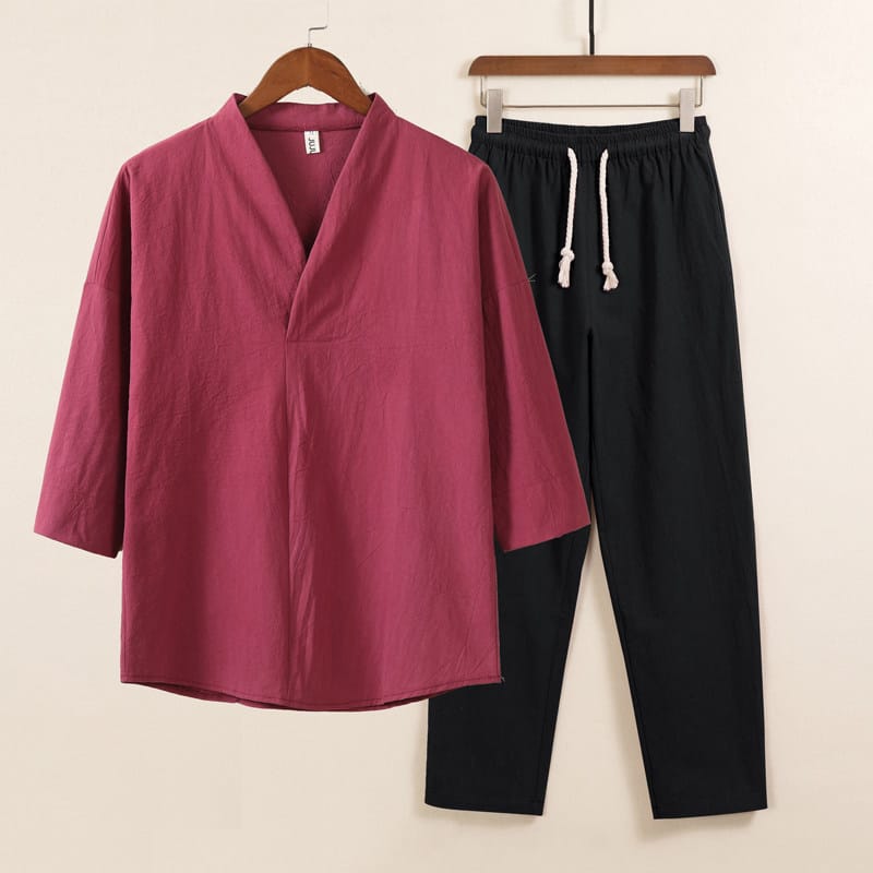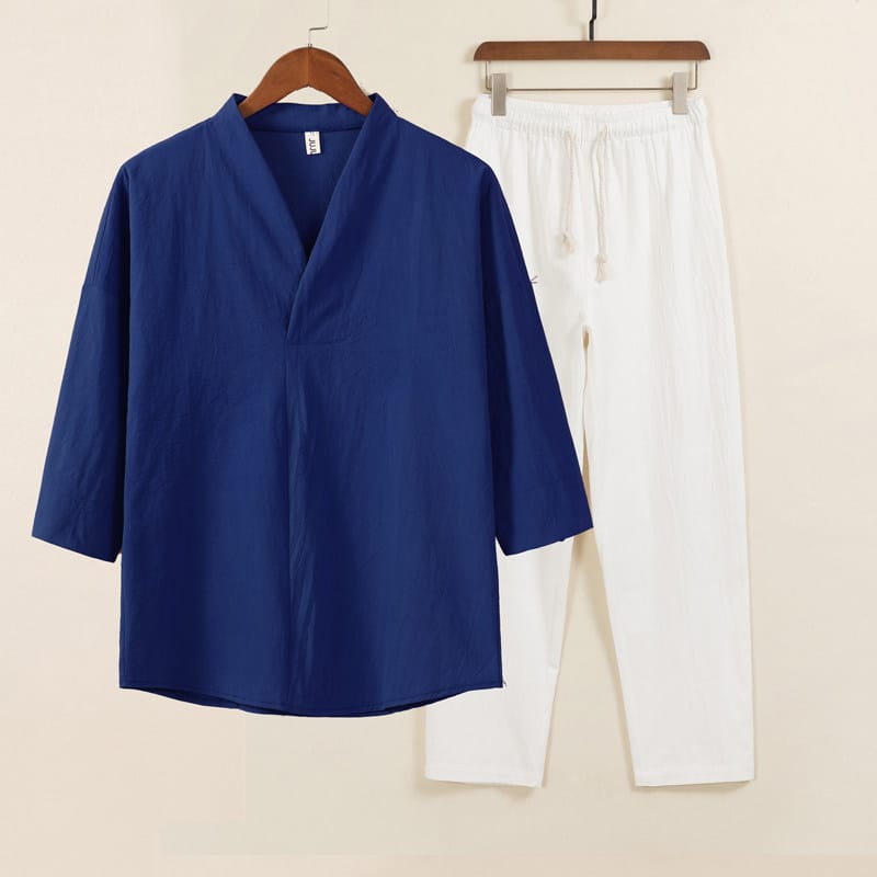綿麻素材のV首メンズ上下セットアップです。シンプルなV衿に七分袖トップスとストレートパンツの2点セット。