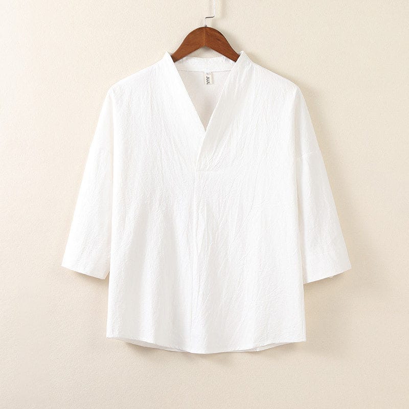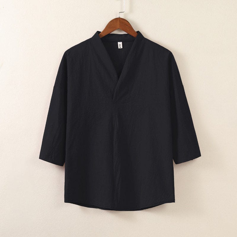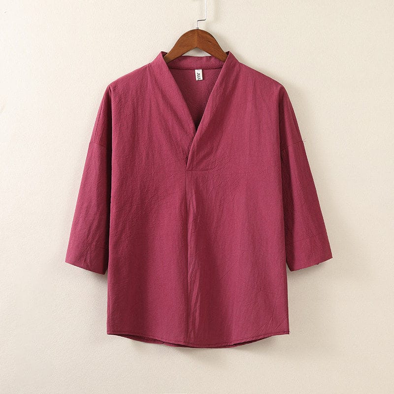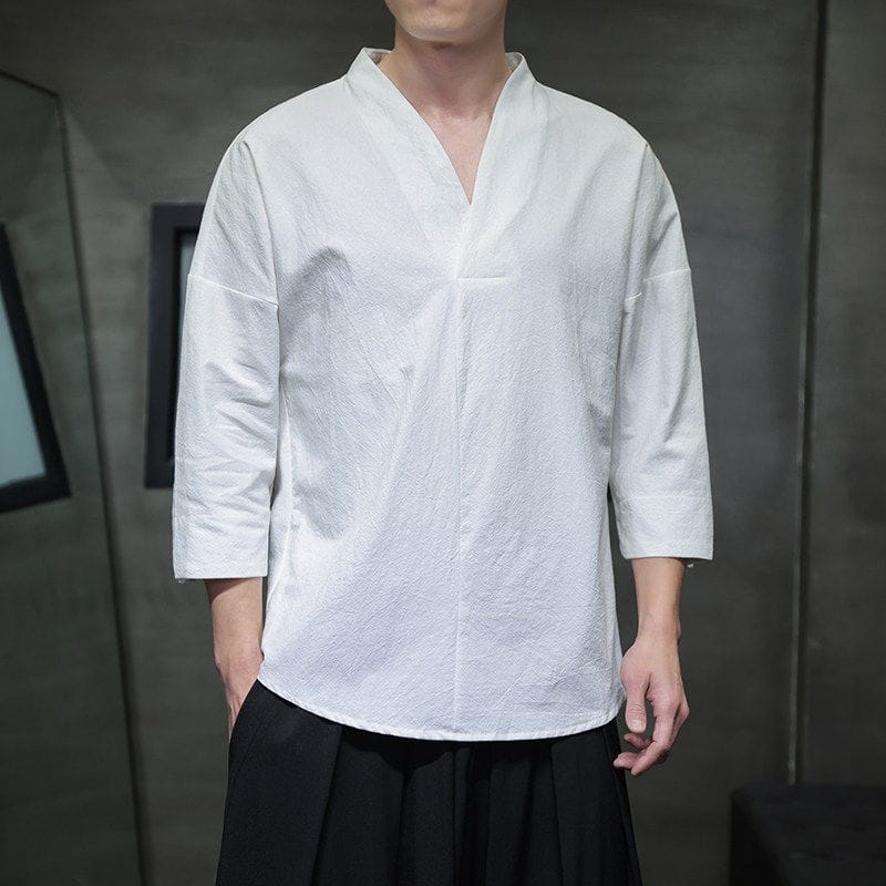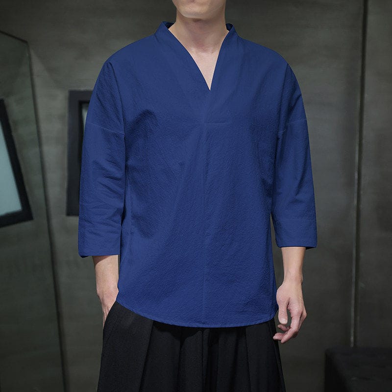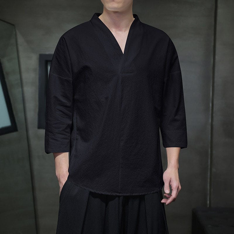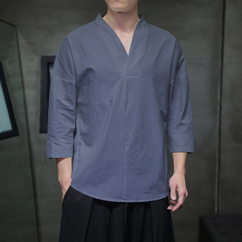 綿麻素材のシンプルなV首メンズ七分袖プルオーバーです。装飾を抑えたミニマルな改良漢服スタイルで、袖口に小さなボタンがさりげないアクセント。