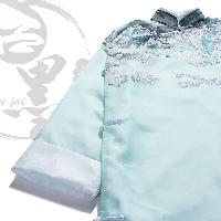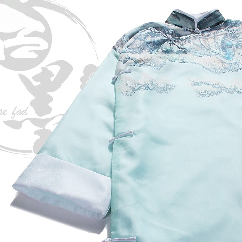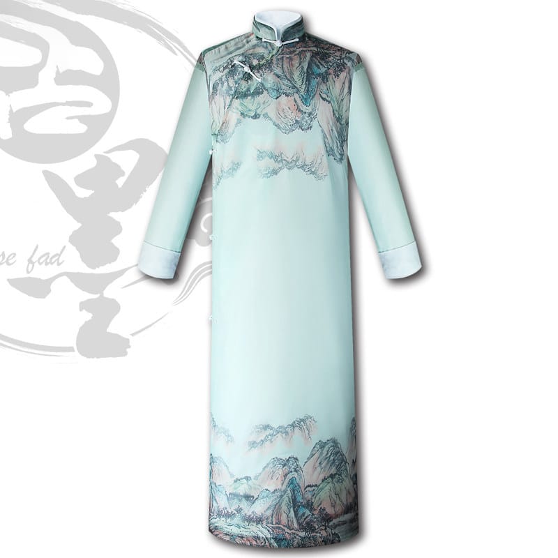 淡青色に水墨画風の山水柄を配した夏向きのチャンパオです。