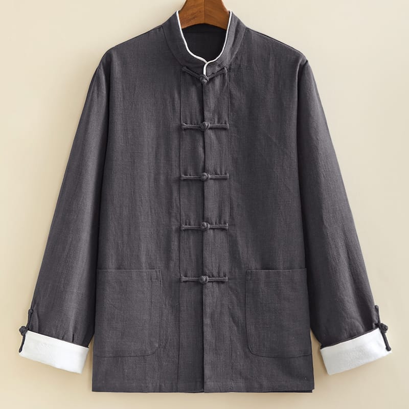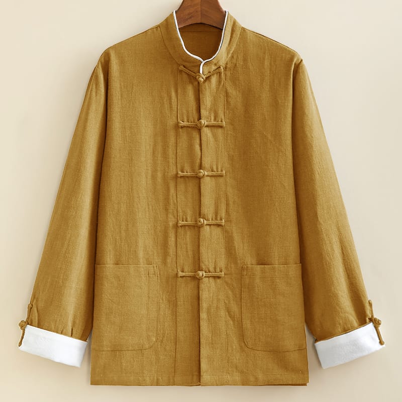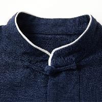 襟周りの白いパイピングが特徴のチャイナジャケットです。フロントの五つのチャイナボタンと、白い折り返し袖口は経典的なチャイナスタイル。