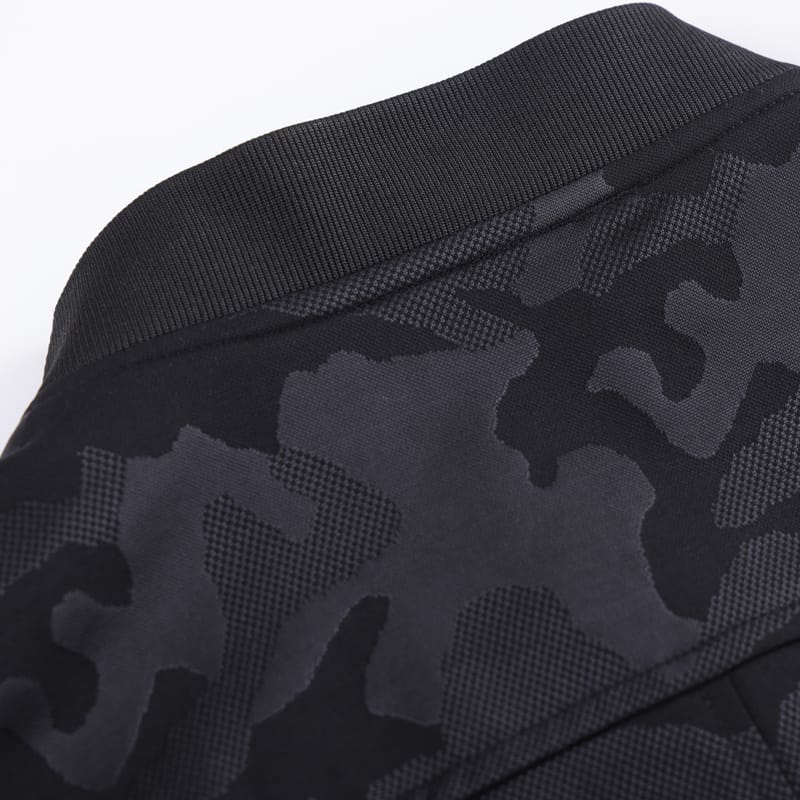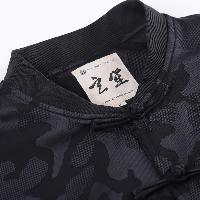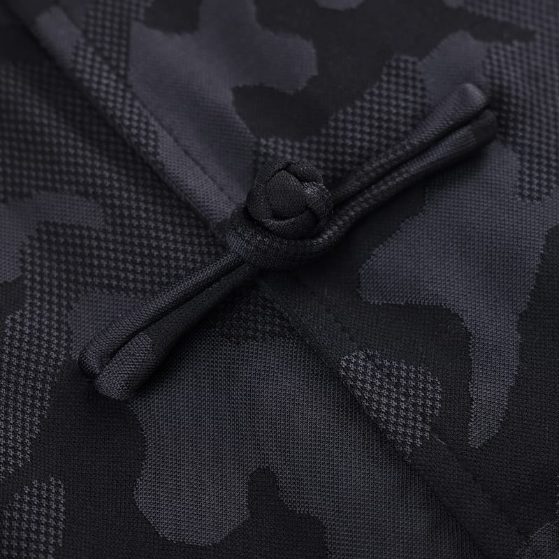 ジャガード織の濃淡で迷彩柄を表現したチャイナジャケットです。リブ編みで作られた立ち襟と袖口が特徴です。