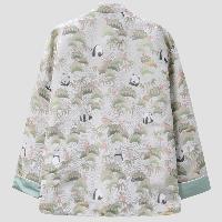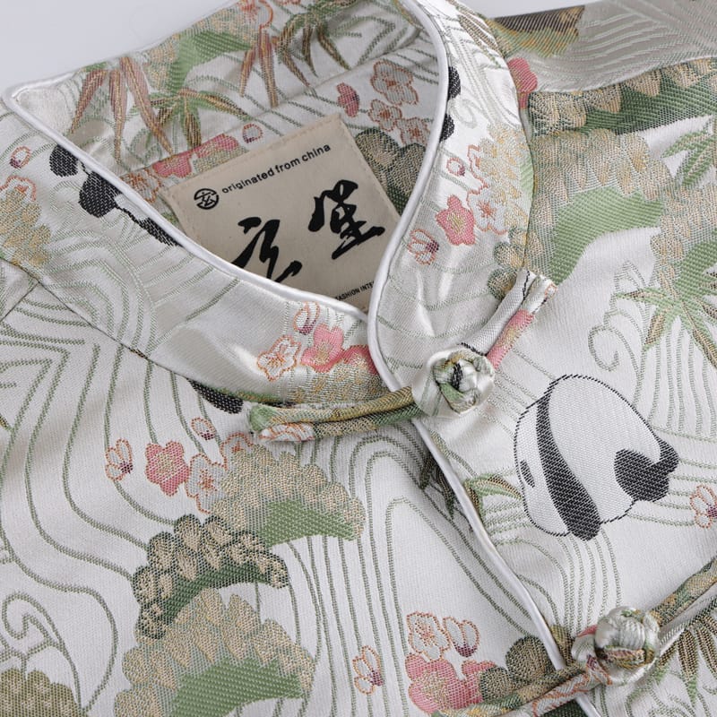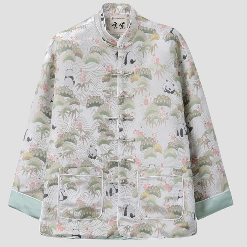 パンダをモチーフにしたチャイナジャケットです。パンダの他に緑の竹、ピンクの花などの伝統的な中華柄が織り込まれています。