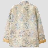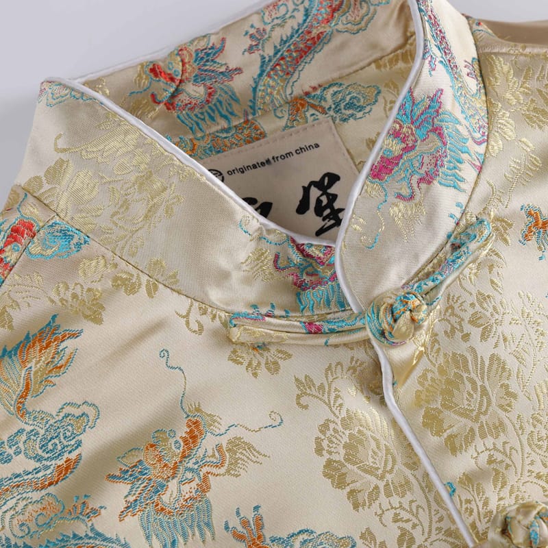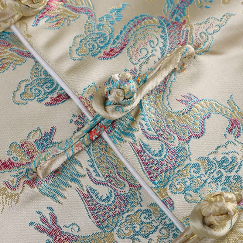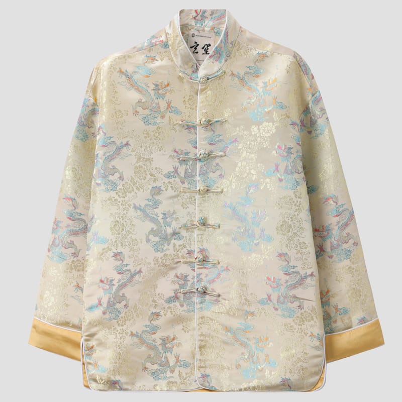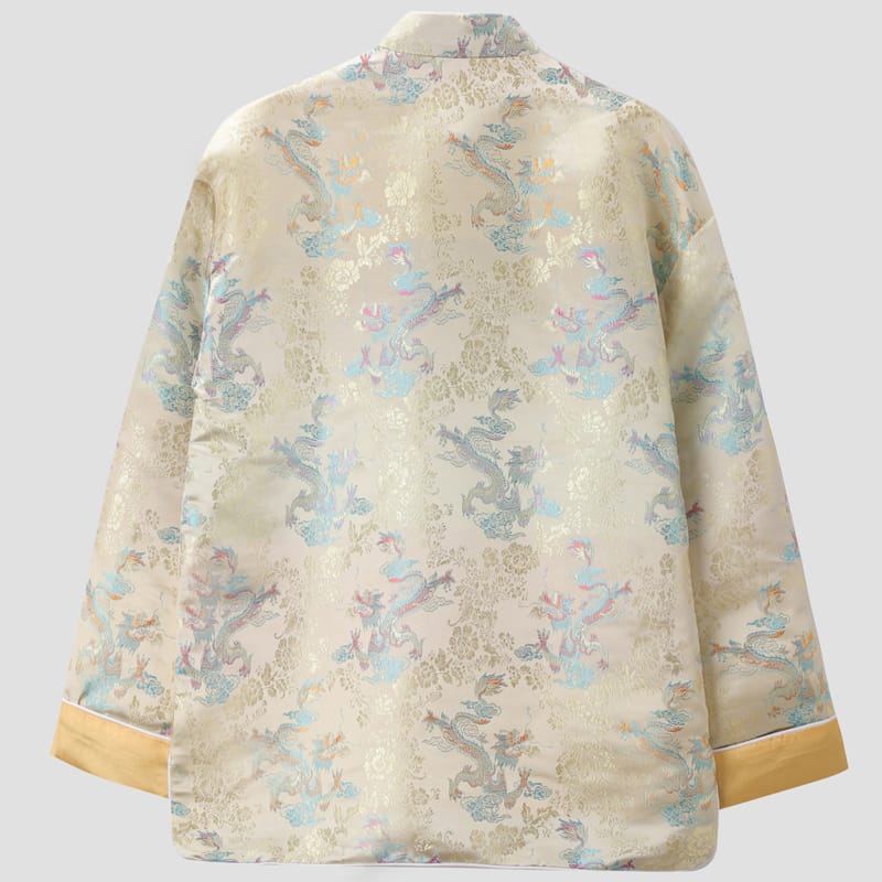 色鮮やかなドラゴン柄をモチーフにしたチャイナジャケットです。繊細なジャガード織で作られた花柄を背景に精巧なドラゴンの刺繍が印象的です。