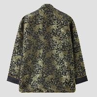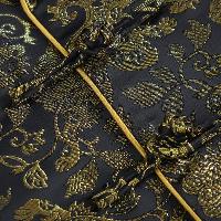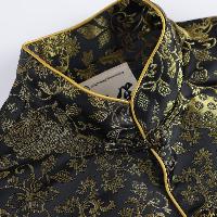 上品な黒地に精緻な金襴模様が全体に施されたチャイナジャケットです。豪華なサテンのような生地で作られており、繊細な花と獅子の模様が織り込まれています。