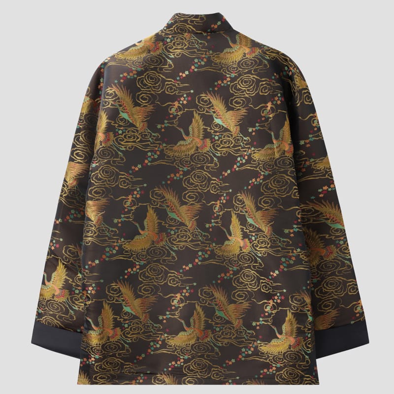 黒地に色鮮やかな鳳凰と雲文様が織り込まれた格調高い外套です。